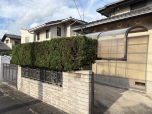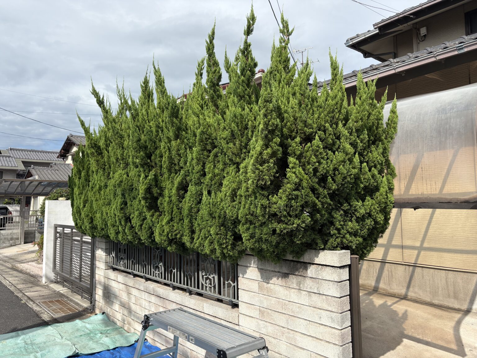 今回のご依頼主様宅でも2本のコニファーがご自宅の窓を遮るほどに葉を茂らせていました。このままでは風通しが悪くなり、内側の枝が枯れてしまう「蒸れ」の原因にもなるため、剪定が必要な状態でした。